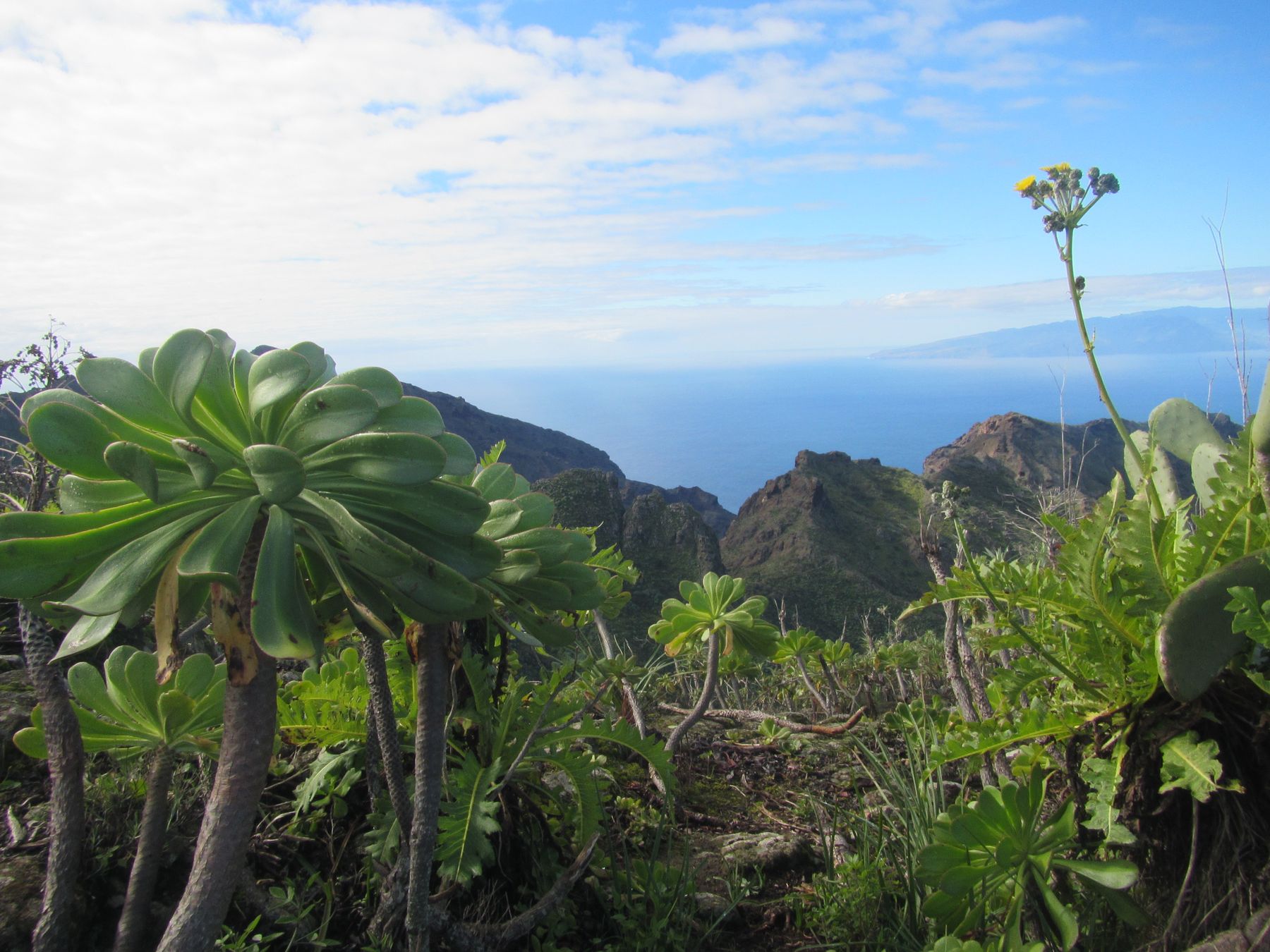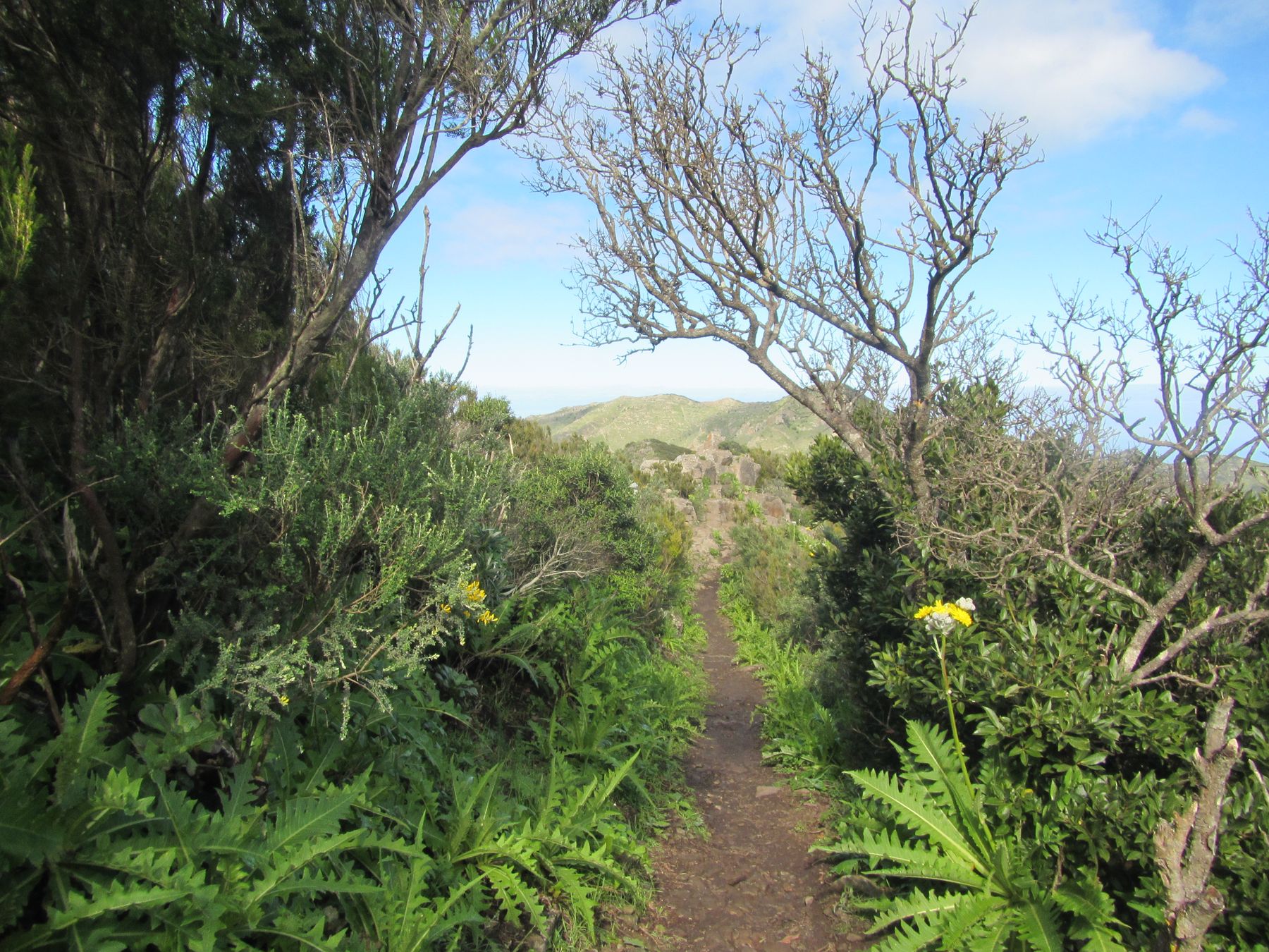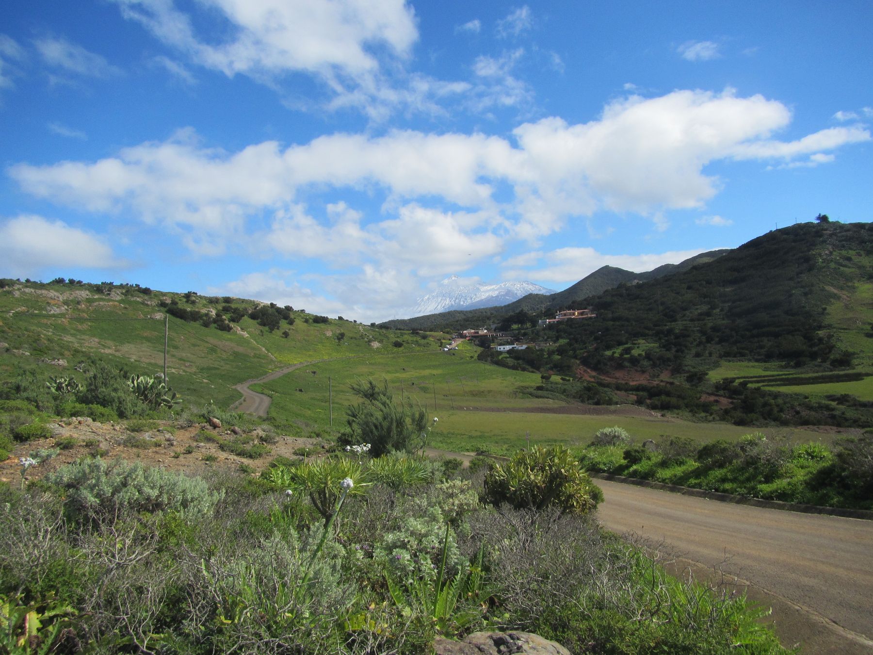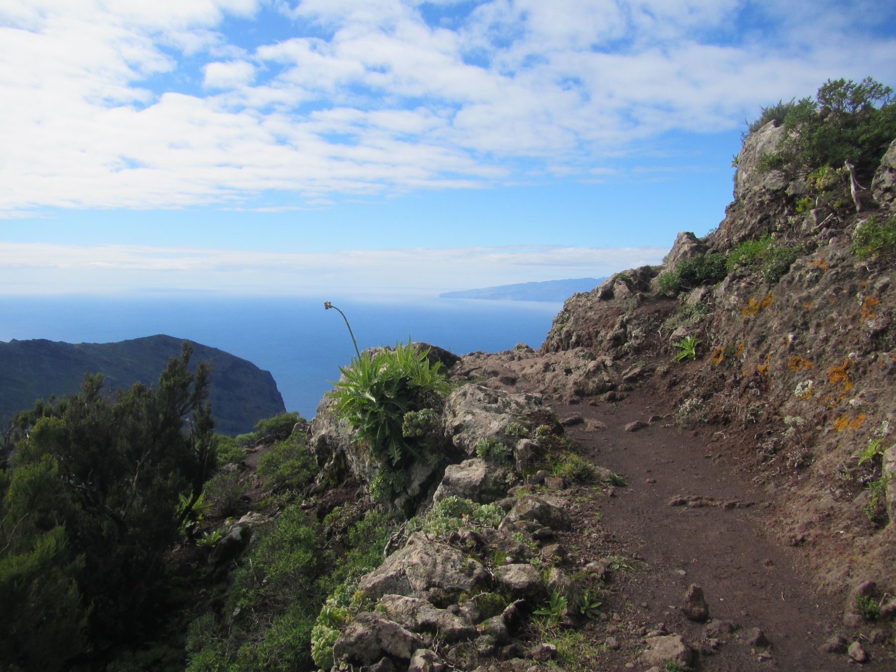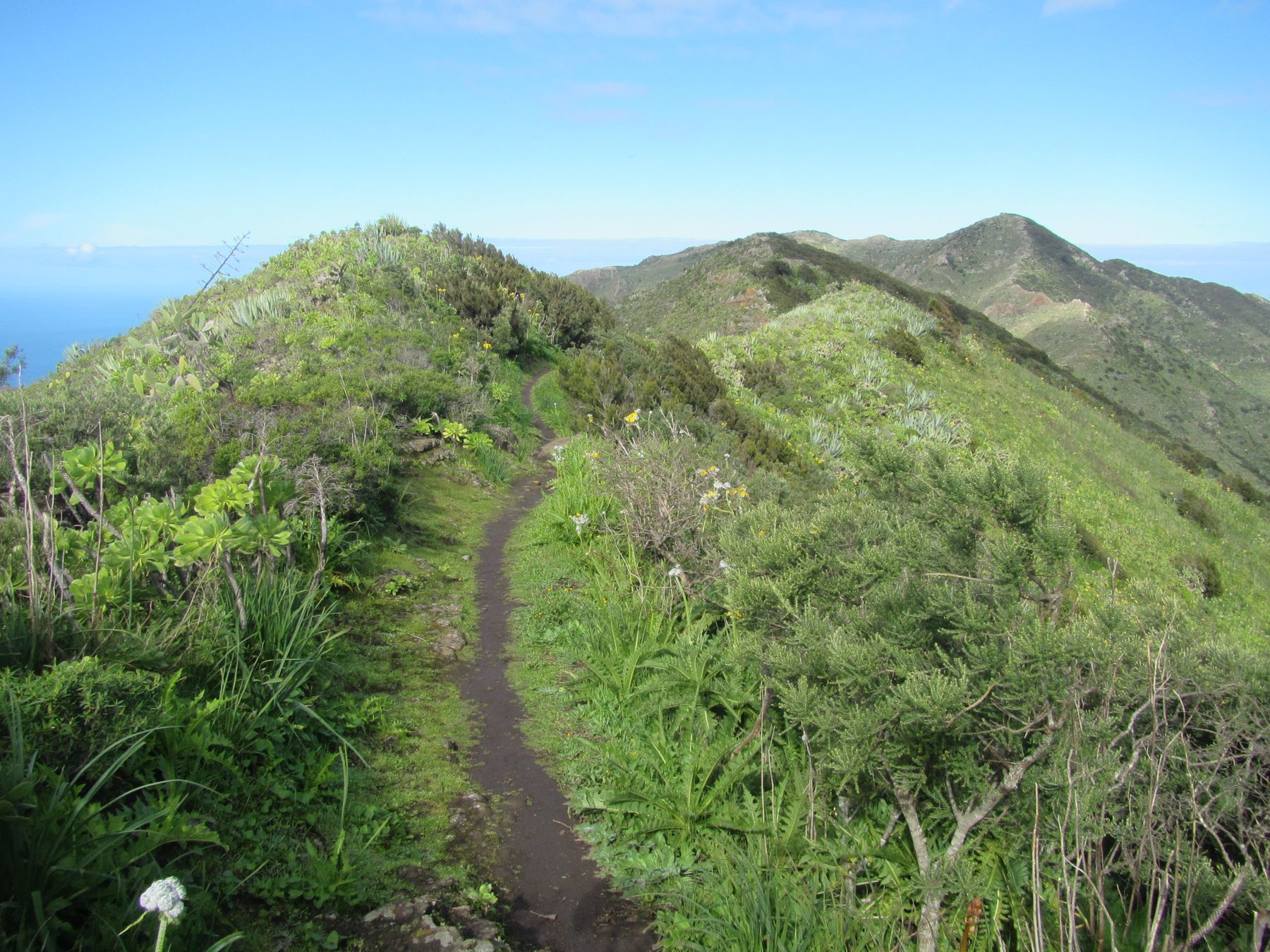 Parádní jednodenní trek po hřebenu Bolico. Z albergue po TF 56 na Cumbre Bolico, většinou lesem, divukrásným podotýkám, pak po hřebenovce TF 51 s výhledy do obou údolí, na Mascu, na zasněžené Teide a na Gomeru, naprostá paráda každý okamžik. Největším výkonem byl výstup na Baracán. Za vesničkou Teno Alto se krajina mění, zvolna se svažuje k pobřeží, celá zelená a šťavnatá, což oceňují nejen oči návštěvnice, ale hlavně kozy, nikoliv téže návštěvnice, ale místních campesinos - vesničanů, kteří mi hbitě prodali sýr. V první chvíli sice nebudil důvěru, protože byl rustikálně ušmudlaný, ale pak jsem ho vyhodnotila jako nejlepší jídlo pobytu. Fakt skvělej. Poslední úsek k majáku jsem umístila na vedlejší stránku.
