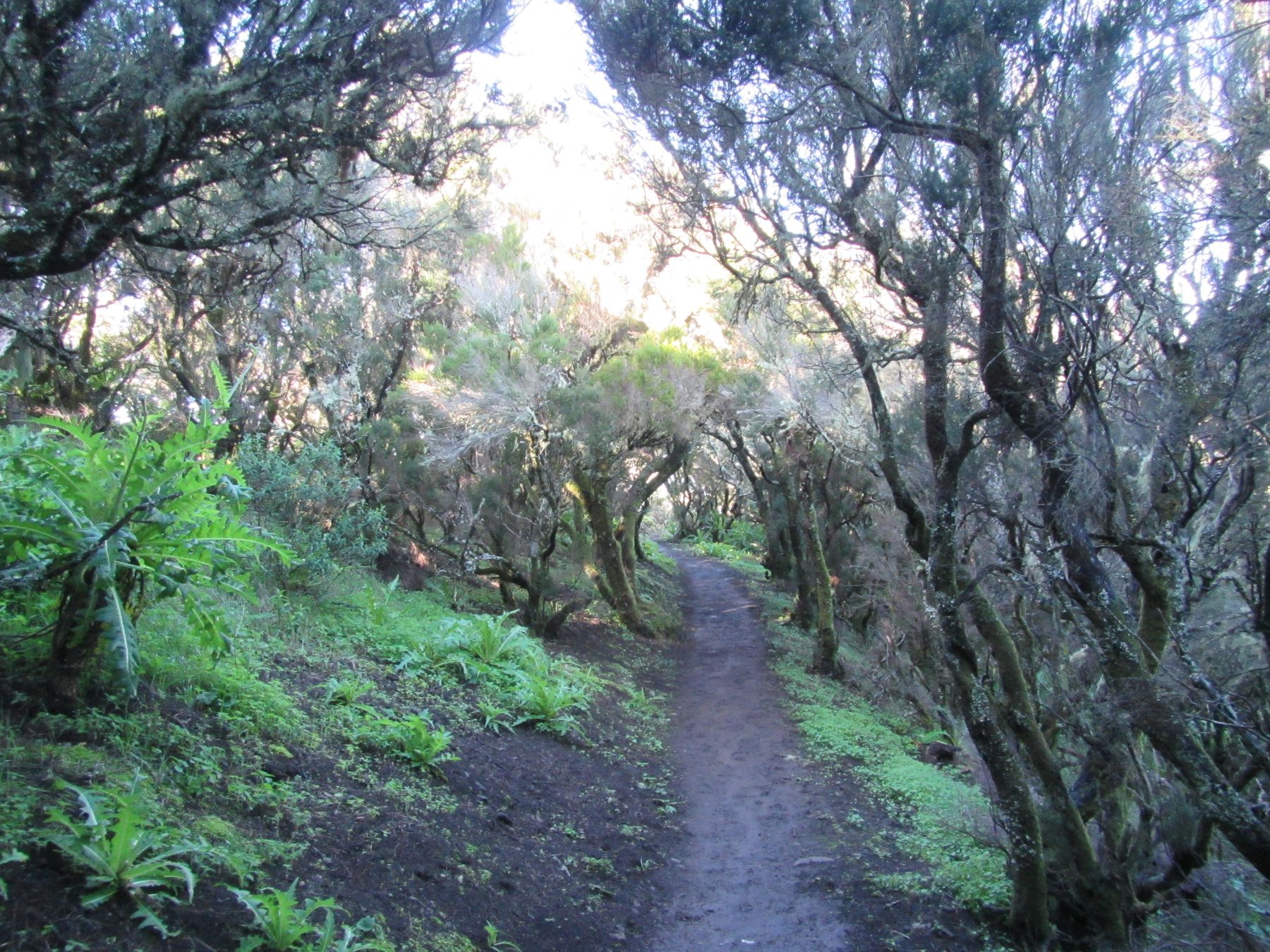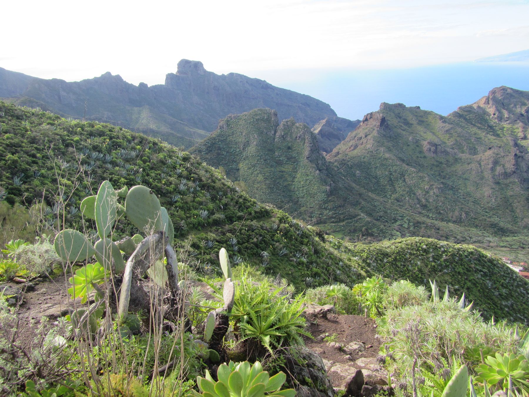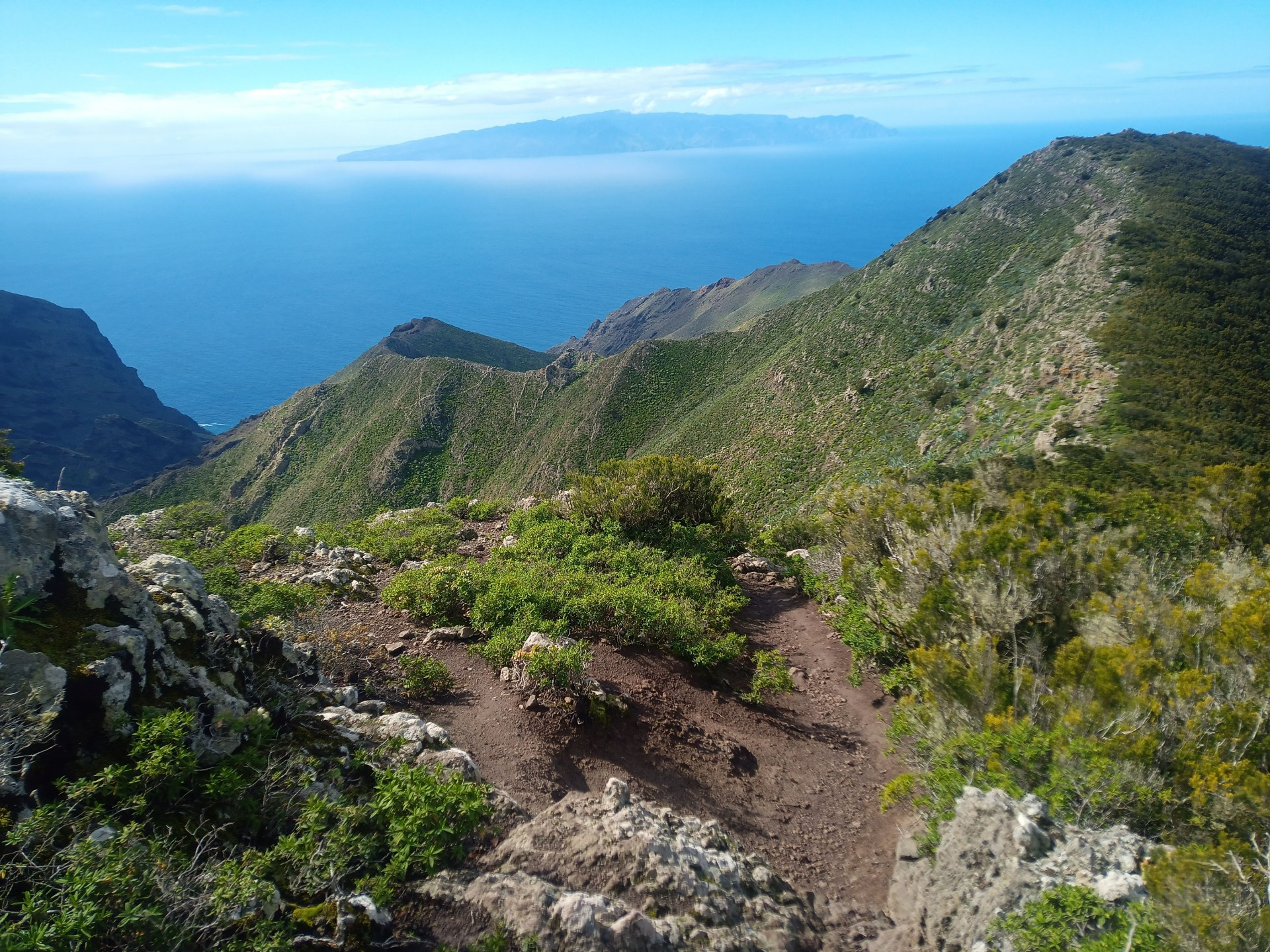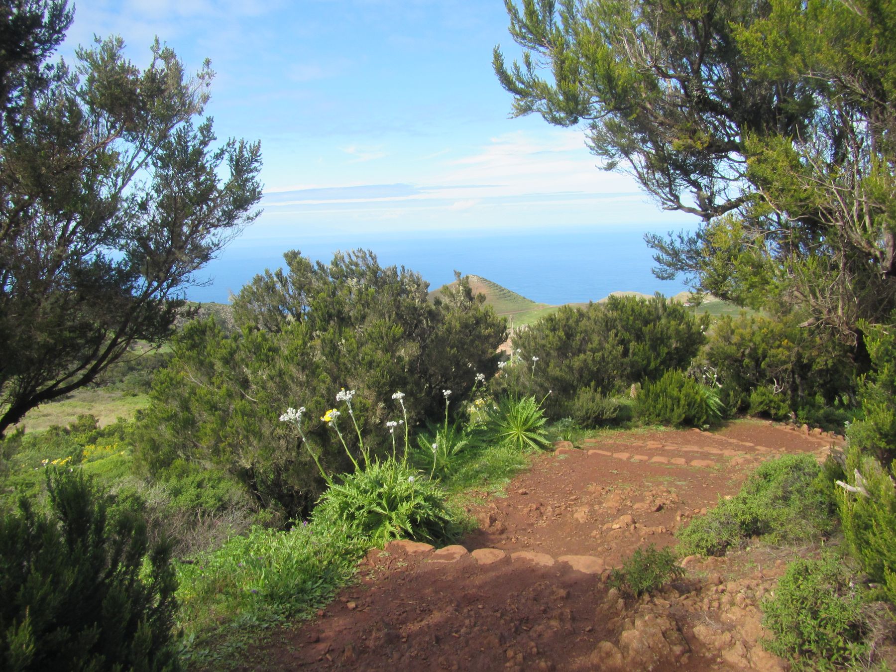 Parádní jednodenní trek po hřebenu Bolico. Z albergue po TF 56 na Cumbre Bolico, většinou lesem, divukrásným podotýkám, pak po hřebenovce TF 51 s výhledy do obou údolí, na Mascu, na zasněžené Teide a na Gomeru, naprostá paráda každý okamžik. Největším výkonem byl výstup na Baracán. Za vesničkou Teno Alto se krajina mění, zvolna se svažuje k pobřeží, celá zelená a šťavnatá, což oceňují nejen oči návštěvnice, ale hlavně kozy, nikoliv téže návštěvnice, ale místních campesinos - vesničanů, kteří mi hbitě prodali sýr. V první chvíli sice nebudil důvěru, protože byl rustikálně ušmudlaný, ale pak jsem ho vyhodnotila jako nejlepší jídlo pobytu. Fakt skvělej. Poslední úsek k majáku jsem umístila na vedlejší stránku.