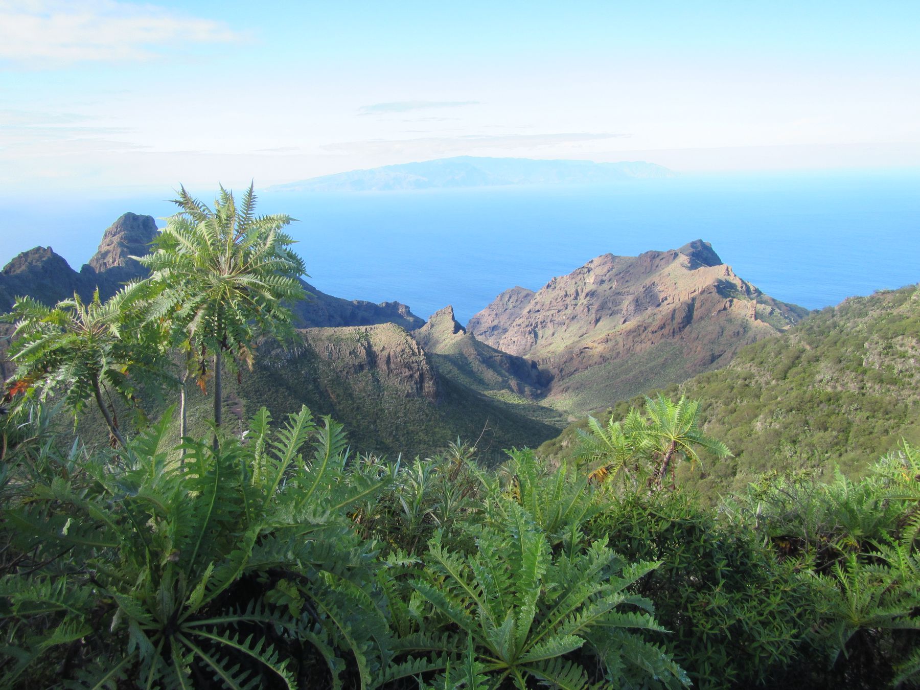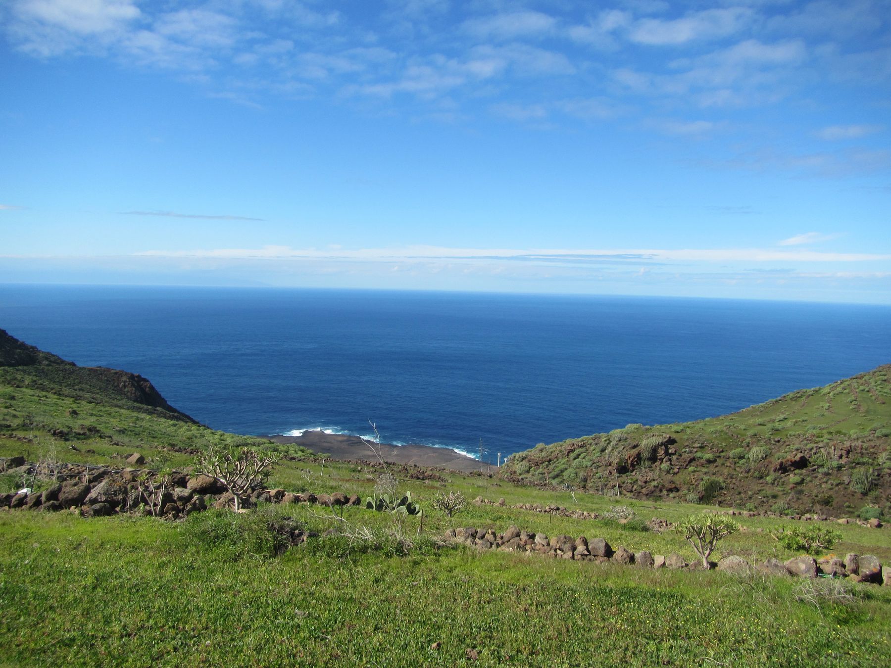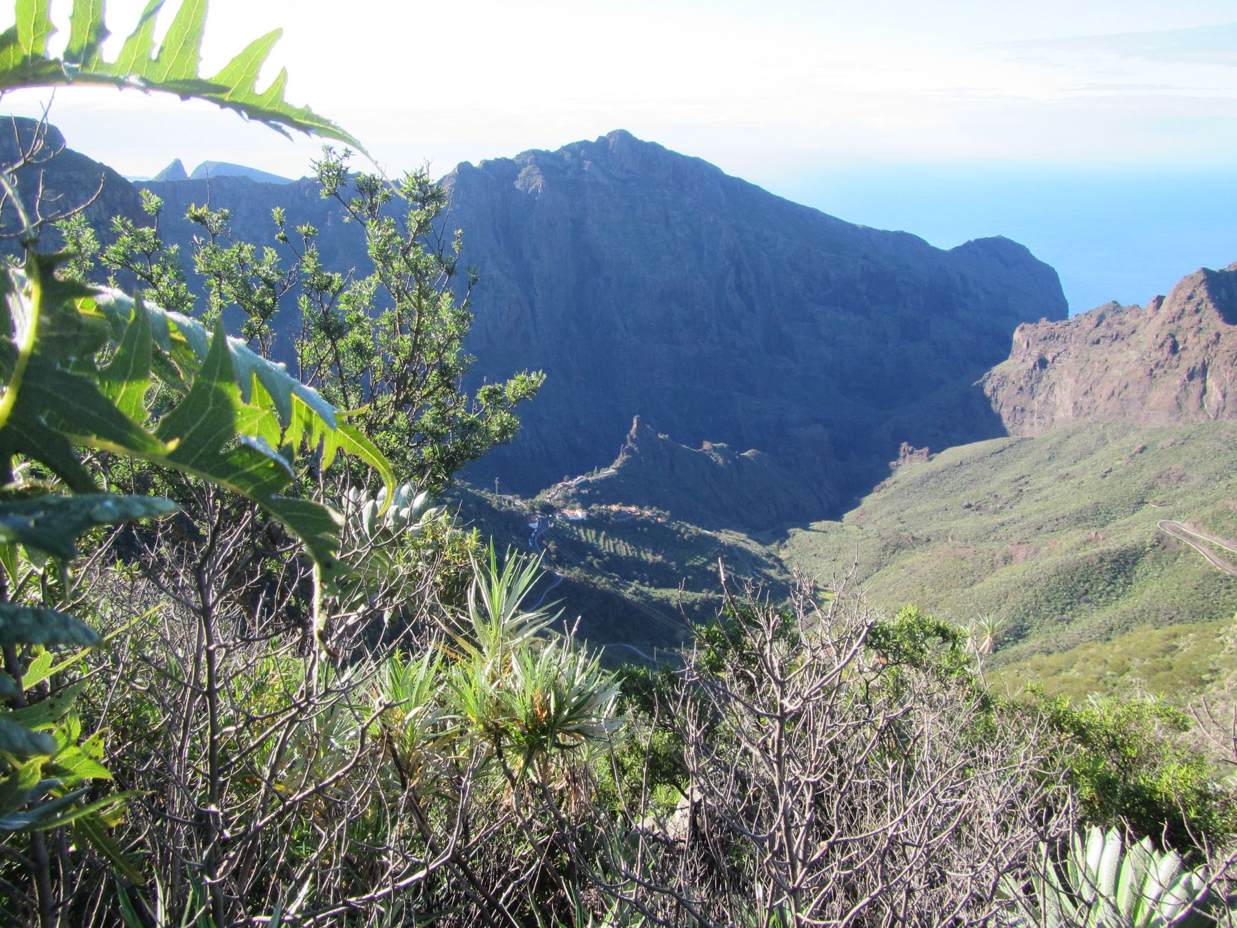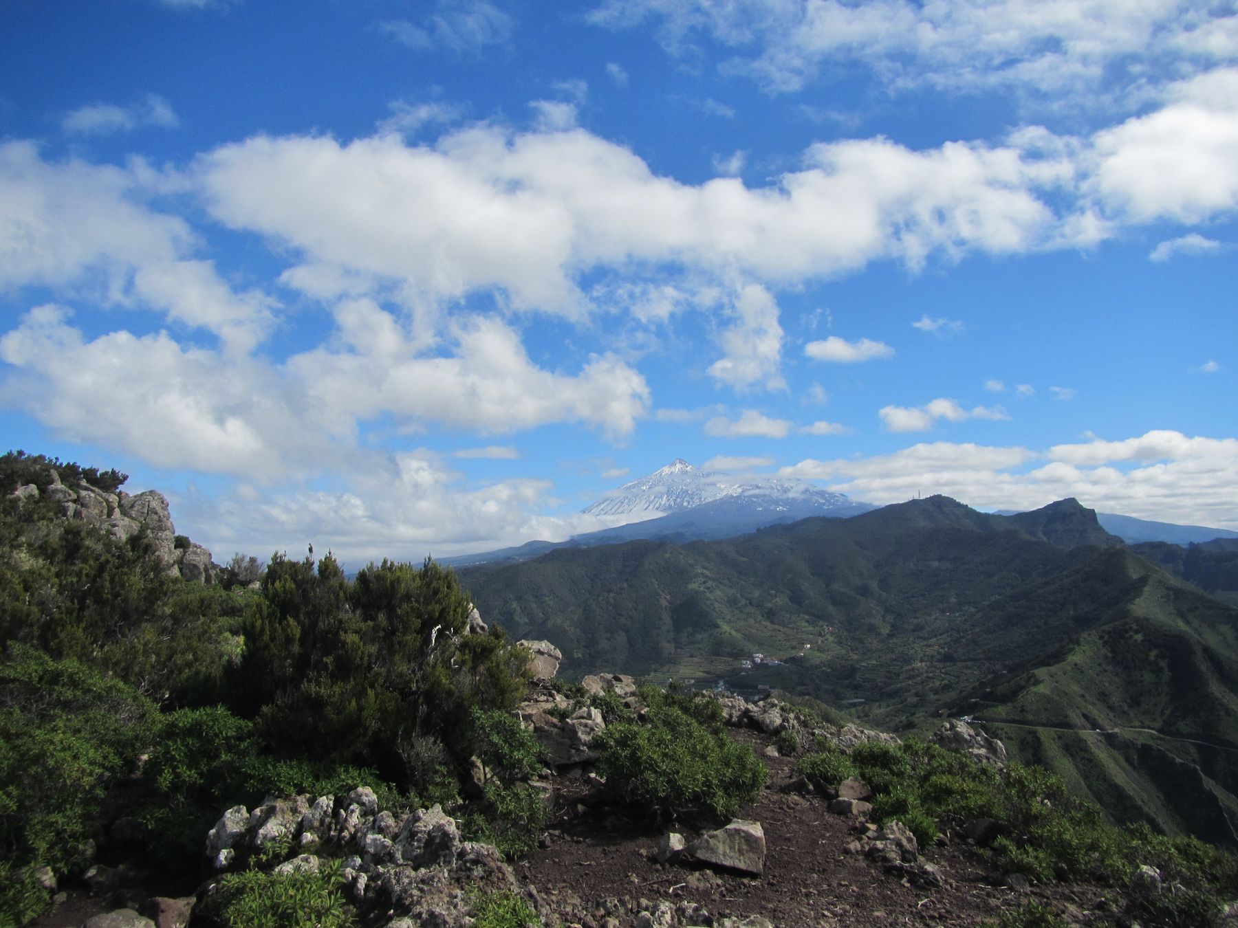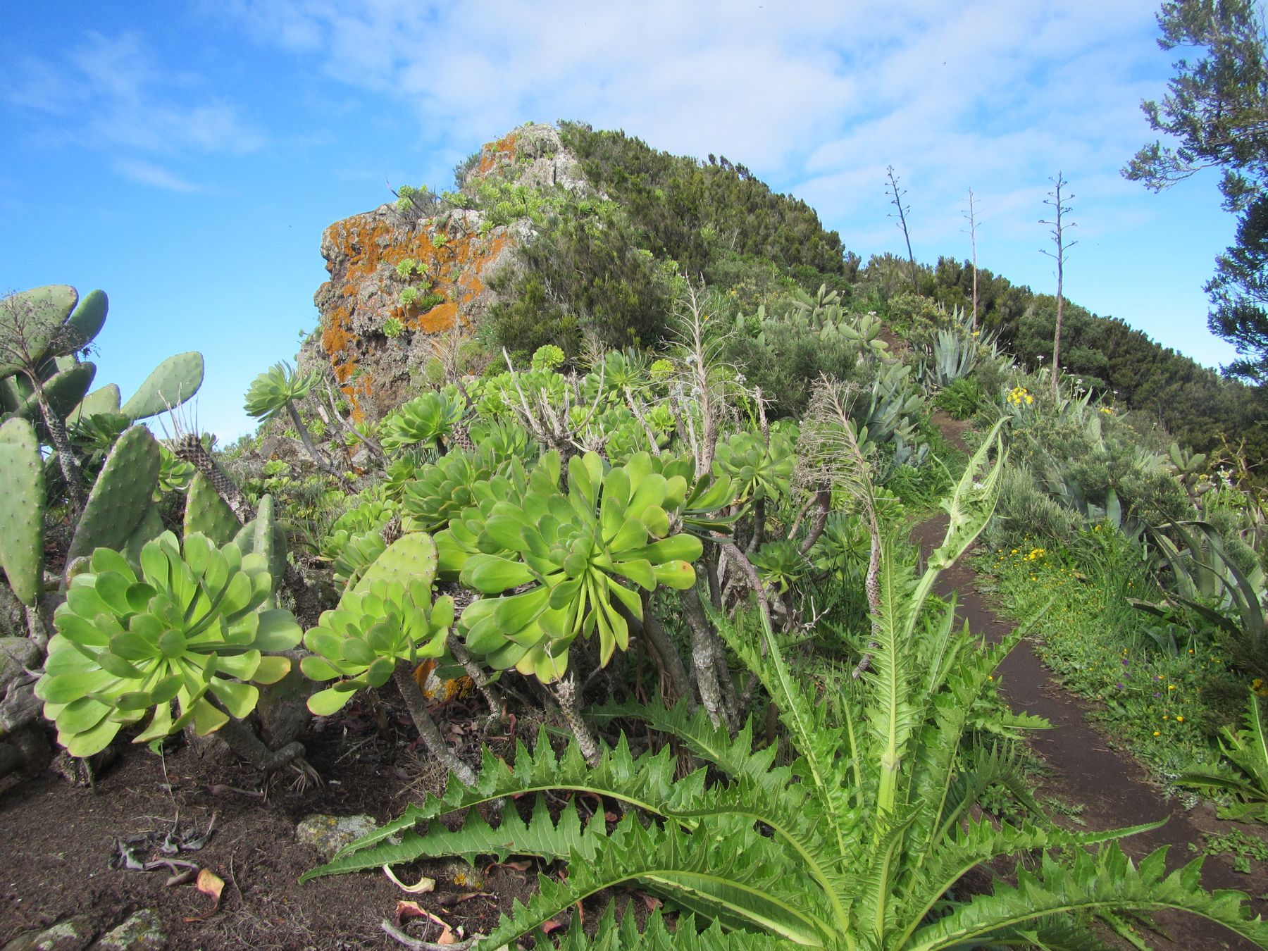 Parádní jednodenní trek po hřebenu Bolico. Z albergue po TF 56 na Cumbre Bolico, většinou lesem, divukrásným podotýkám, pak po hřebenovce TF 51 s výhledy do obou údolí, na Mascu, na zasněžené Teide a na Gomeru, naprostá paráda každý okamžik. Největším výkonem byl výstup na Baracán. Za vesničkou Teno Alto se krajina mění, zvolna se svažuje k pobřeží, celá zelená a šťavnatá, což oceňují nejen oči návštěvnice, ale hlavně kozy, nikoliv téže návštěvnice, ale místních campesinos - vesničanů, kteří mi hbitě prodali sýr. V první chvíli sice nebudil důvěru, protože byl rustikálně ušmudlaný, ale pak jsem ho vyhodnotila jako nejlepší jídlo pobytu. Fakt skvělej. Poslední úsek k majáku jsem umístila na vedlejší stránku.
