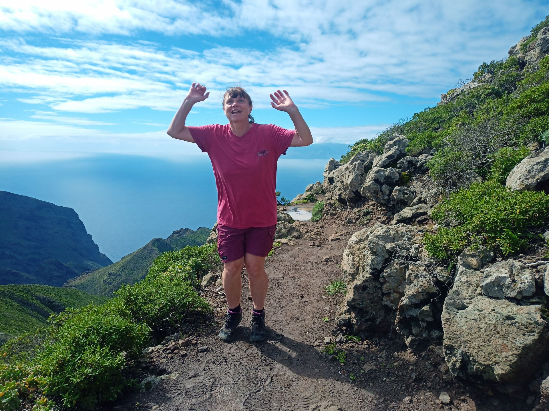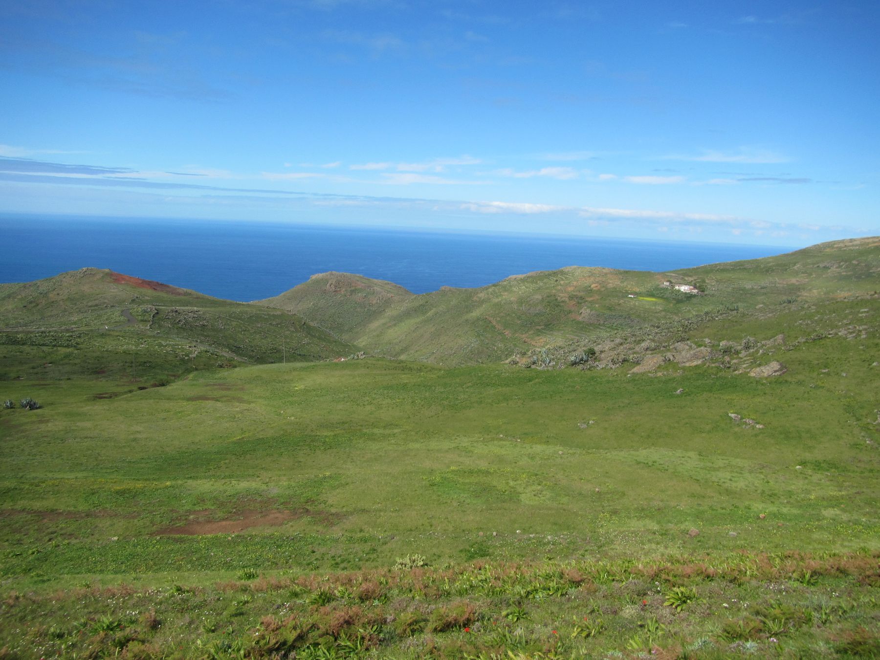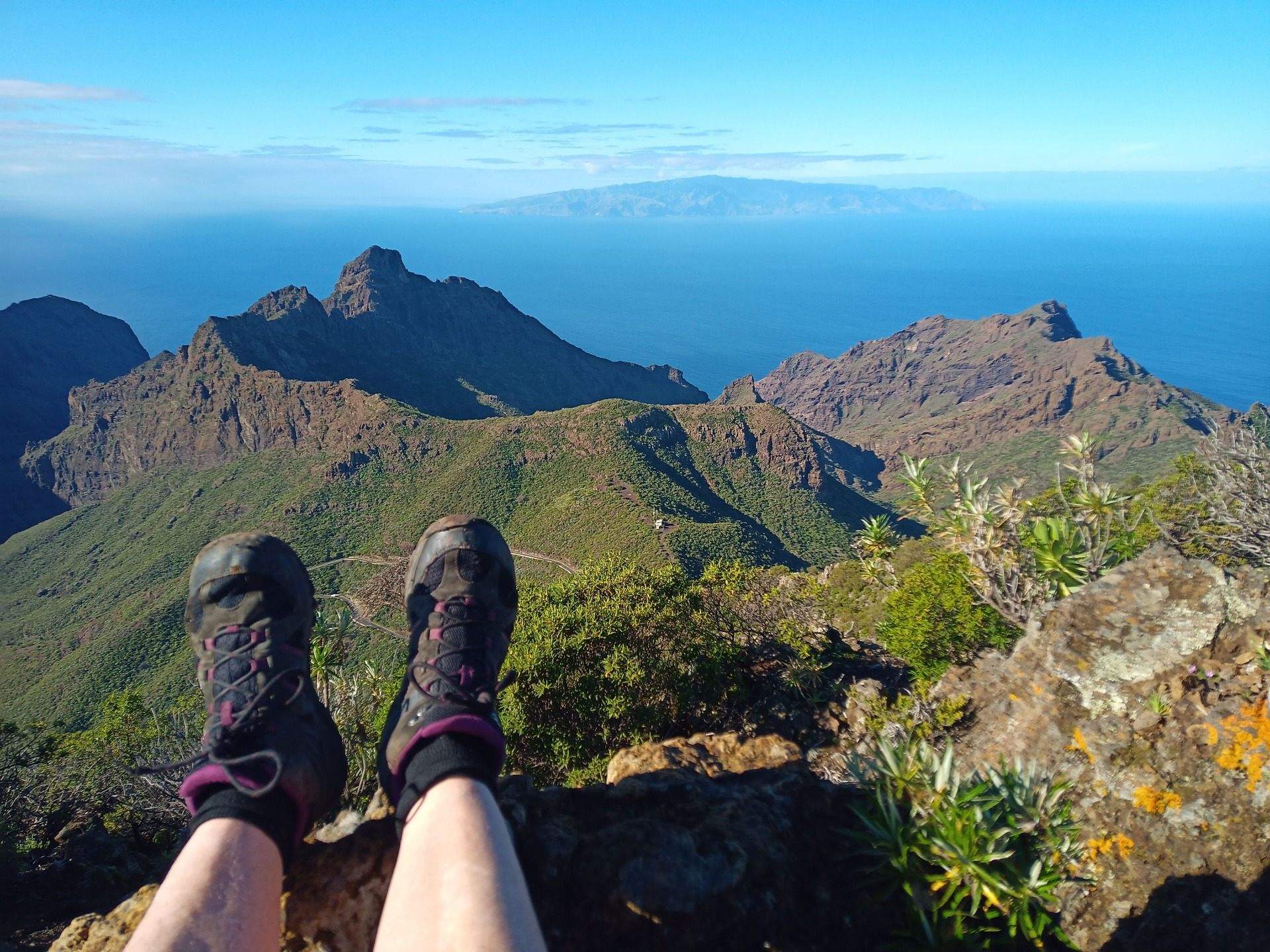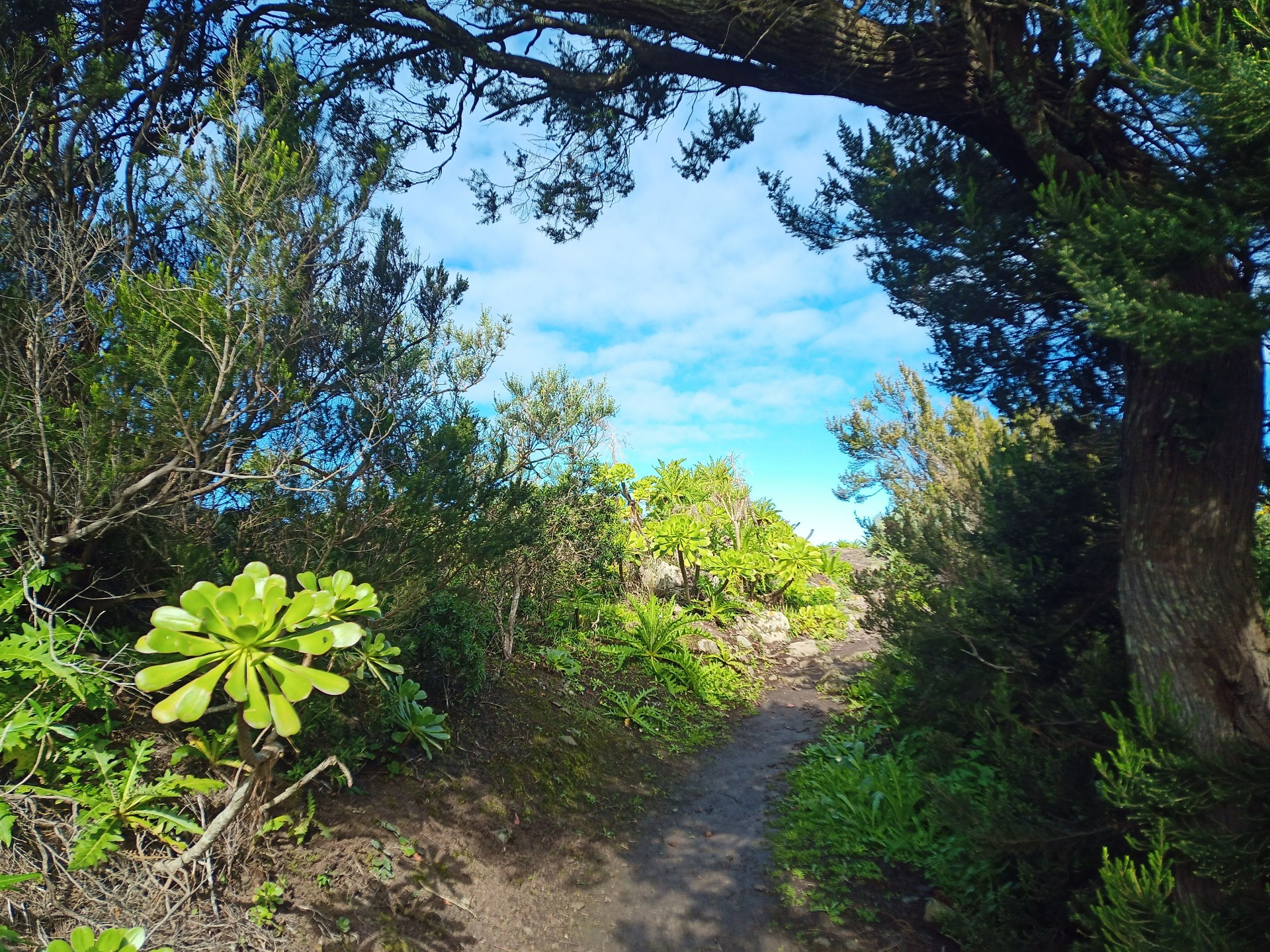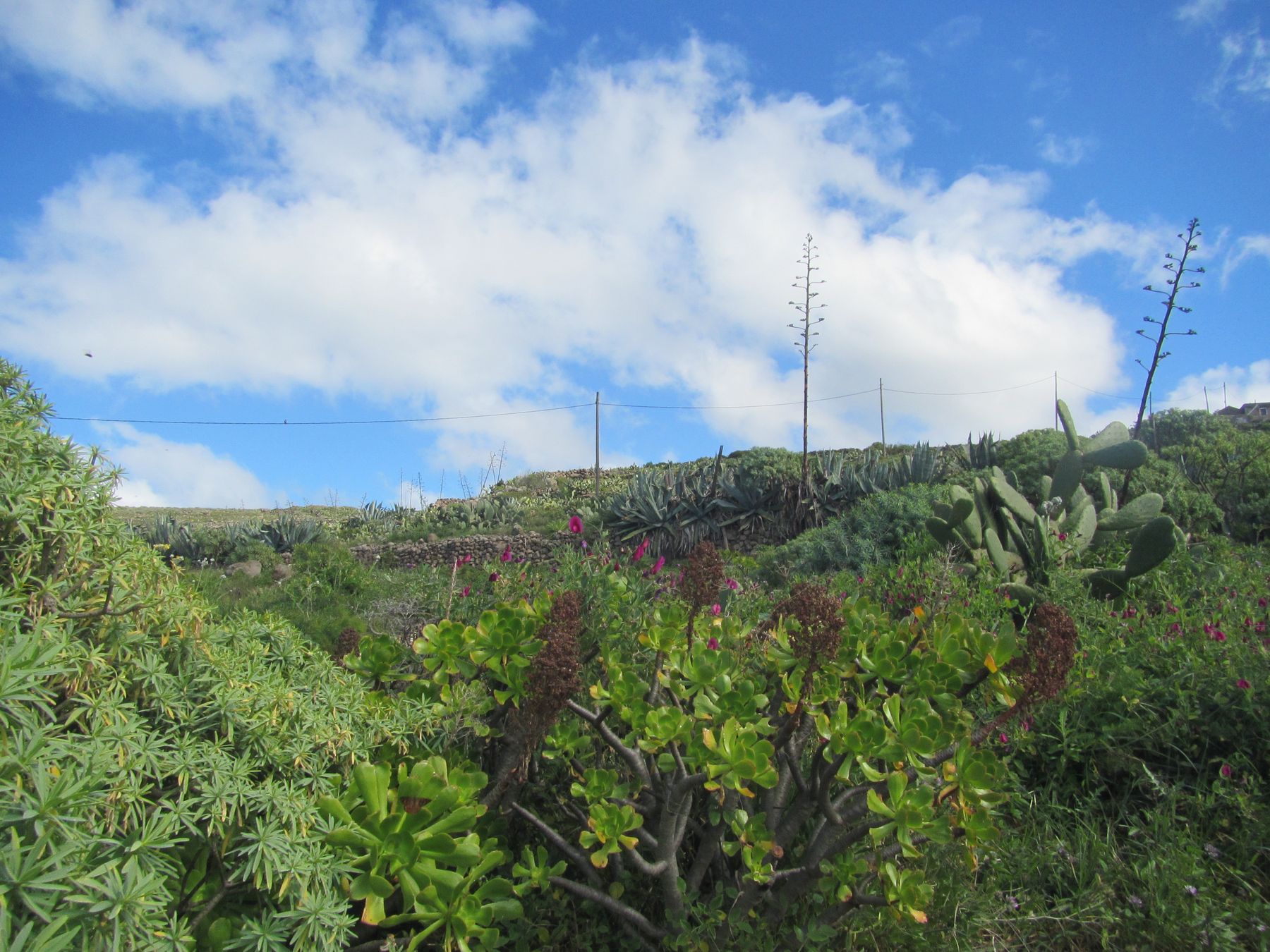 Parádní jednodenní trek po hřebenu Bolico. Z albergue po TF 56 na Cumbre Bolico, většinou lesem, divukrásným podotýkám, pak po hřebenovce TF 51 s výhledy do obou údolí, na Mascu, na zasněžené Teide a na Gomeru, naprostá paráda každý okamžik. Největším výkonem byl výstup na Baracán. Za vesničkou Teno Alto se krajina mění, zvolna se svažuje k pobřeží, celá zelená a šťavnatá, což oceňují nejen oči návštěvnice, ale hlavně kozy, nikoliv téže návštěvnice, ale místních campesinos - vesničanů, kteří mi hbitě prodali sýr. V první chvíli sice nebudil důvěru, protože byl rustikálně ušmudlaný, ale pak jsem ho vyhodnotila jako nejlepší jídlo pobytu. Fakt skvělej. Poslední úsek k majáku jsem umístila na vedlejší stránku.